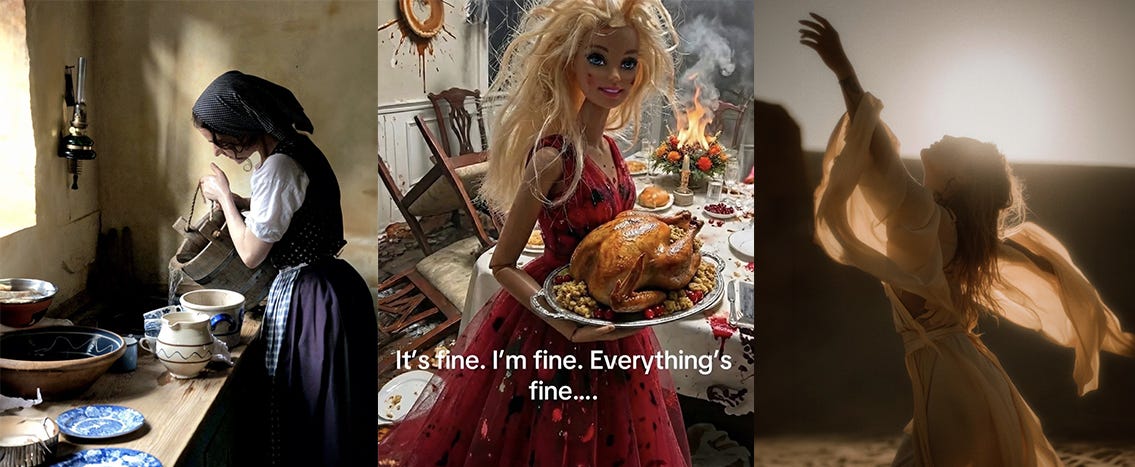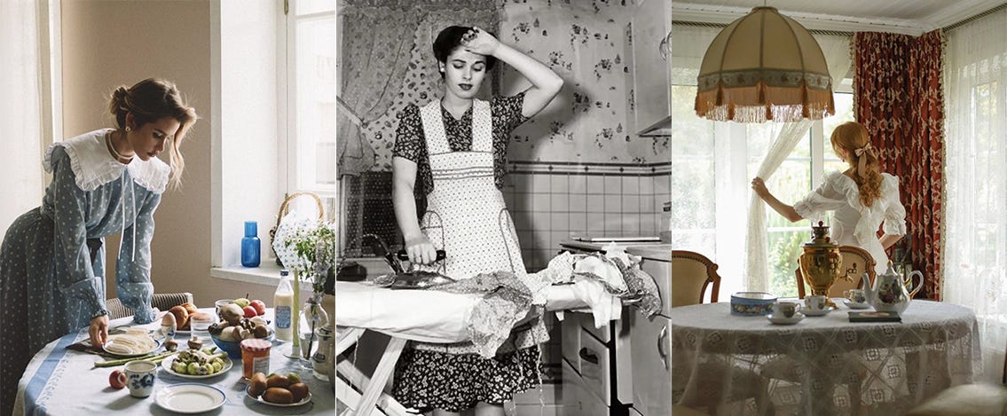 My daughter’s feed is full of tradwife fantasies and cottage-core slow living. Lanolin candles. Homemade sourdough. Women twirling in white linen in pastoral locations like an Anthropologie ad for obedience. I don’t see anyone glamorizing scrubbing a toilet or scraping something unidentifiable off a floor. Instead, we get fetishized, glamorized, and deeply class-coded activities. A mother making a Twinkie from scratch because “we don’t consume store-bought ingredients.”