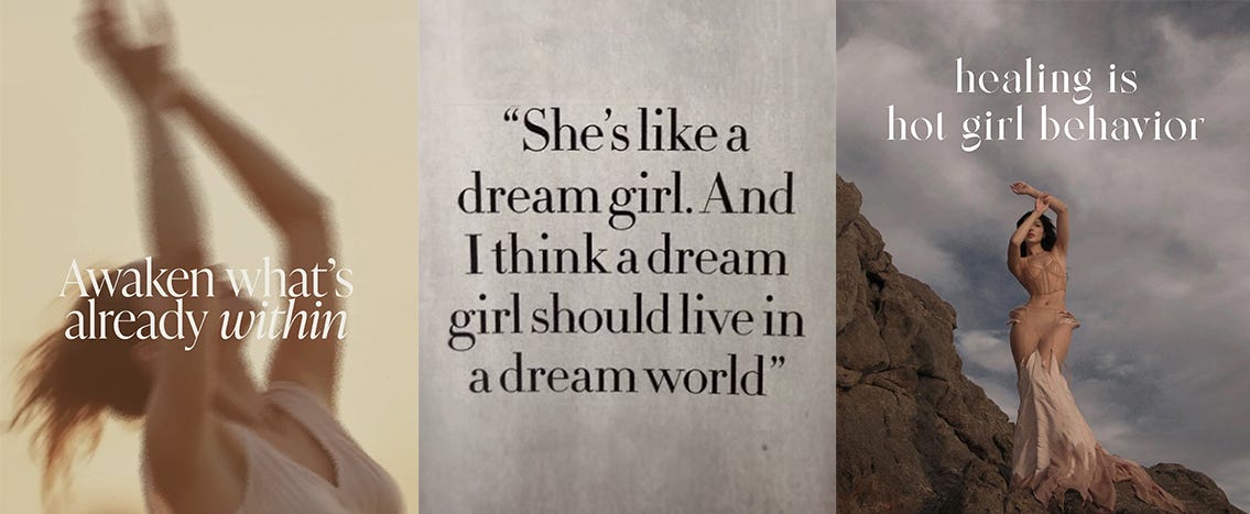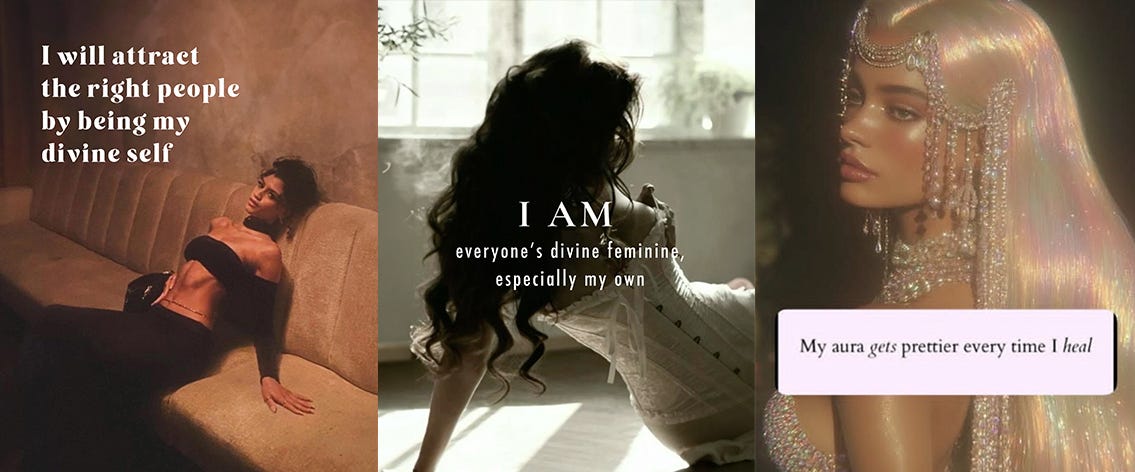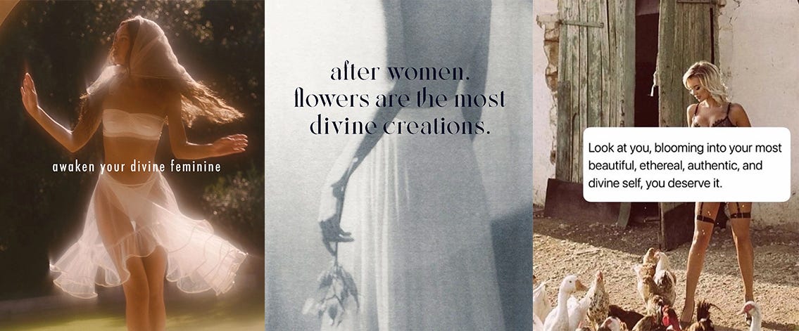 And here’s where it gets interesting or infuriating, depending on your tolerance for spiritual bypassing. Buried in this dreamy invocation of the divine feminine is the same story about women that’s been keeping us subordinate for centuries. It’s just the remix with an ASMR voice.